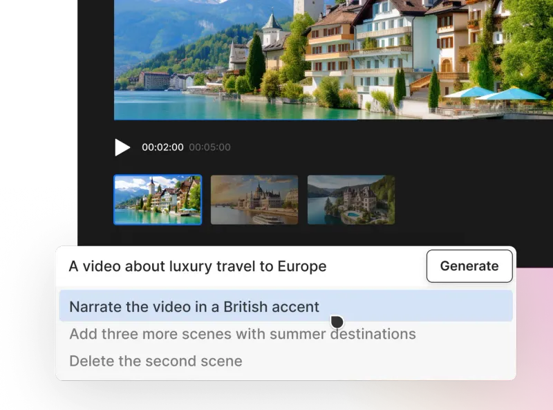 An AI video editor to turn text prompts into ready-to-share videos like ads, explainers, and stories.